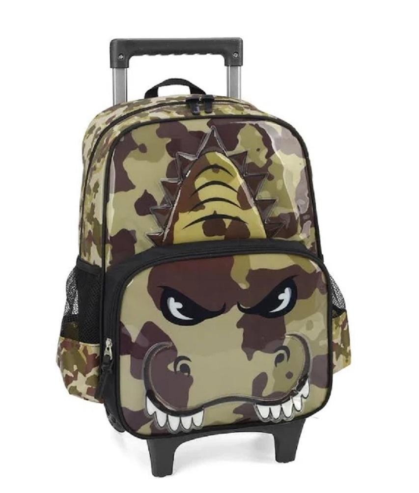 Mochila infantil ideal para meninos e meninas, modelo com rodinhas para facilitar o transporte, confeccionado em poliéster e pvc proporcionando maior resistência, com estampa camuflada e um jacaré na parte frontal. Possui repartição única no compartimento principal que conta com fechamento por zíper, além dos bolsos laterais com elástico e o compartimento frontal com zíper.