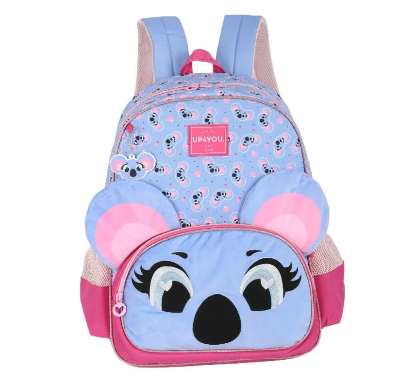 Mochila com bolsos laterias em tela com elástico, alças de costas espumadas e reguláveis, silk frontal, bolso frontal com zíper, alça de mão e etiquetas personalizadas.