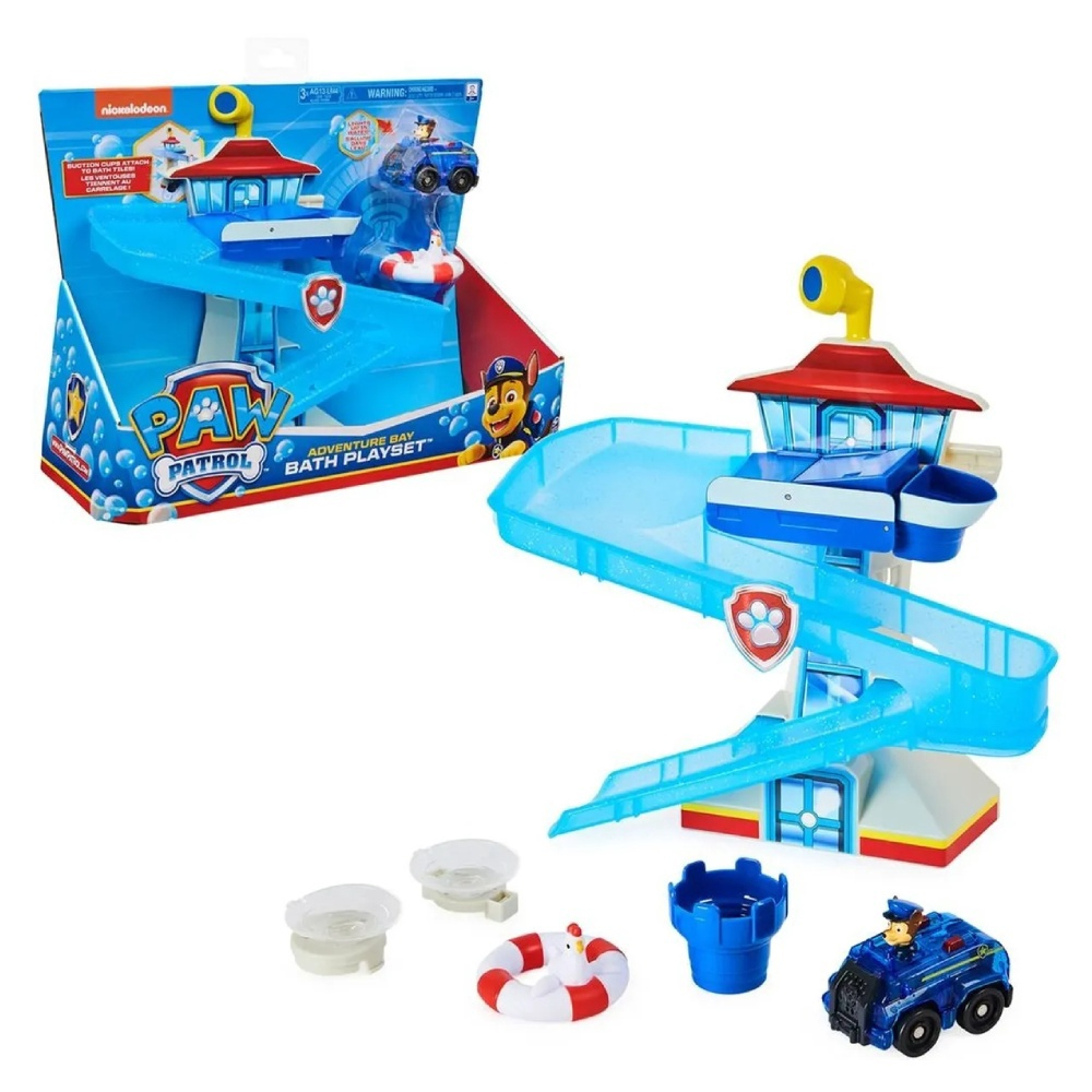 O brinquedo de banho tem 2 ventosas, é fácil prender o Adventure Bay Bath Playset nos ladrilhos e parede, para que fique no lugar enquanto as crianças brincam de suas aventuras de resgate na hora do banho. Este divertido playset de banho vem com o carrinho do Chase. Salve Chickaletta da banheira e salve o dia com Chase. Traga a emoção de Paw Patrol direto para a banheira da sua casa! Encha o topo da Adventure Bay Tower com água para lançar o veículo do Chase correndo pela pista para resgatar Chickaletta.