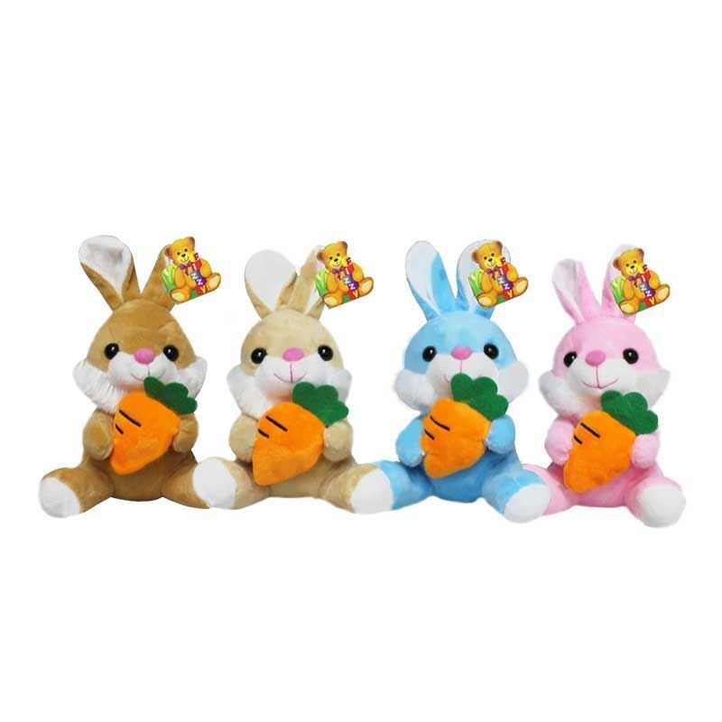 \par Coelhos sortidos segurando cenourinha: marrom, marrom claro, azul e rosa. 14cm