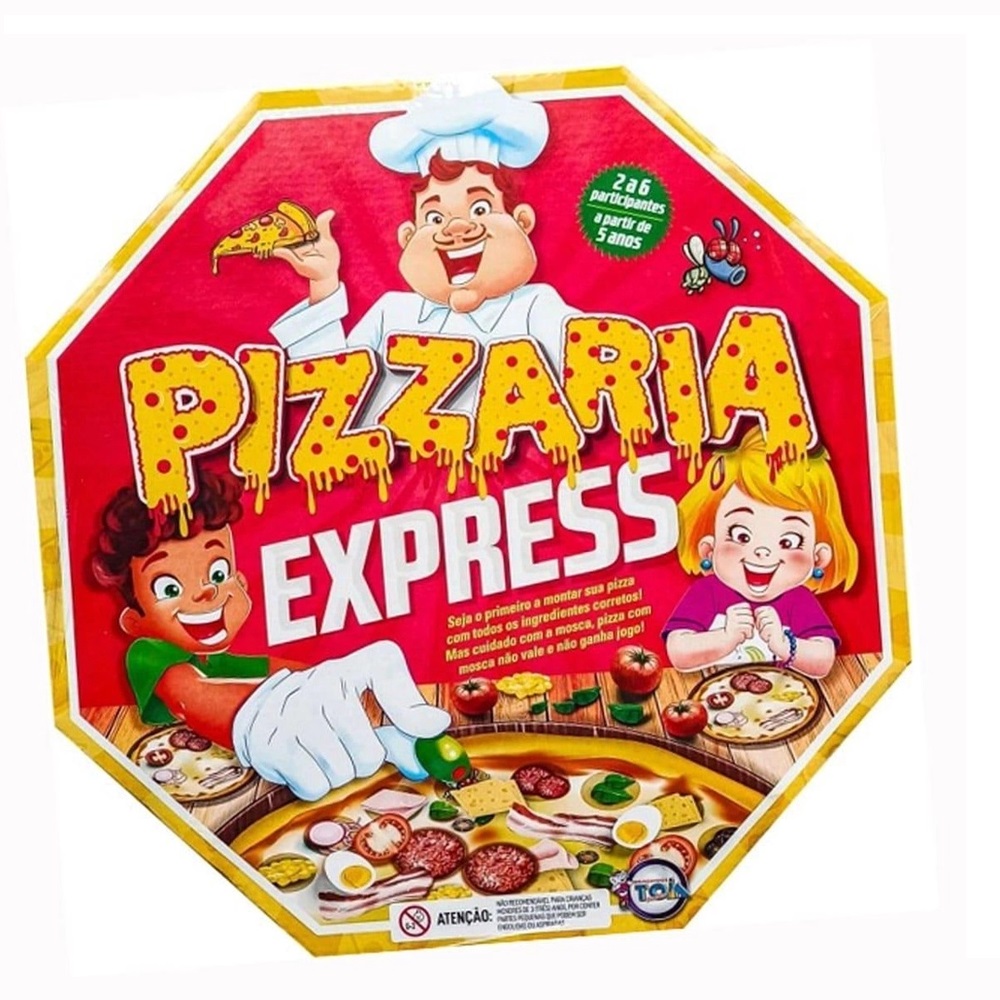 Pizzaria Express traz seis pizzas brotinhos para você montar pegando os ingredientes que estão no tabuleiro. Mas cuidado, você poderá ganhar e perder ingredientes durante o jogo e muito cuidado para não ganhar uma mosca de seu adversário.