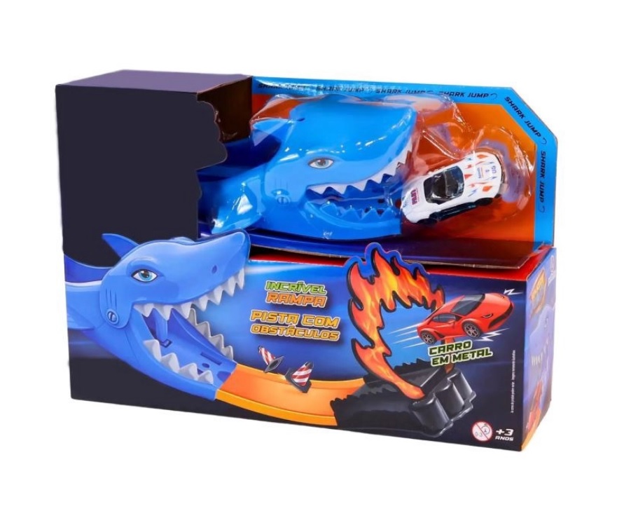 \par - Conte\'fado da Embalagem: Pista Tubar\'e3o Shark, 13 pe\'e7as com 1 carrinho de metal