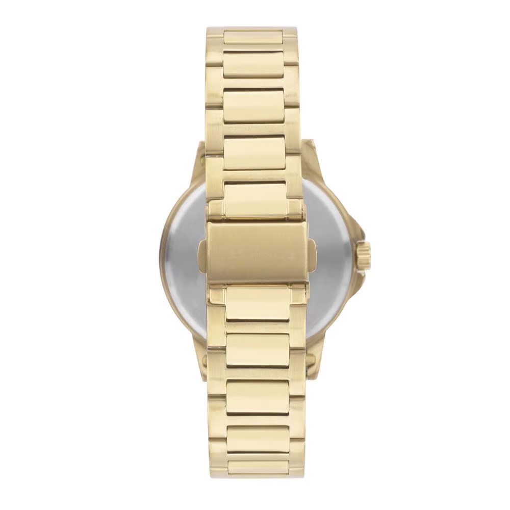 \par Produto 100% em a\'e7o inoxid\'e1vel, com banho dourado, m\'e1quina quartz japonesa Miyota e resist\'eancia \'e0 \'e1gua de 50m. Tamanho de caixa 38mm.