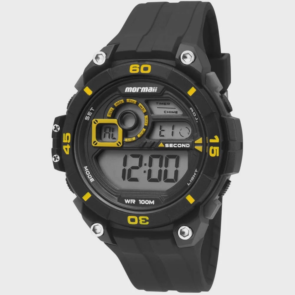 Relógio mormaii da linha wave a prova dágua 100m. modelo da coleção acqua que traz detalhes em amarelo. item com pulseira de polímero preto e caixa também em polímero 45mm, display digital positivo.