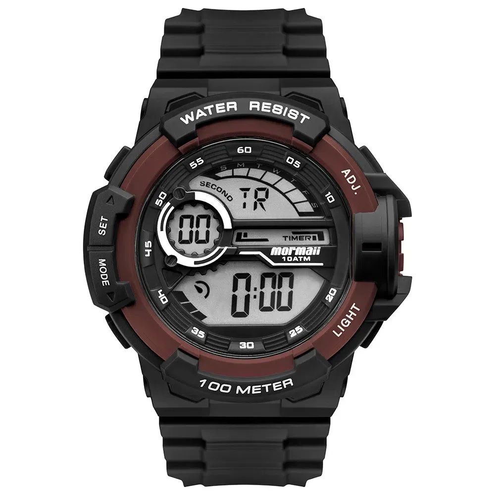 Relógio masculino Mormaii da linha Wave com caixa 52 mm em polímero e detalhe do aro em vermelho. Mostrador digital positivo e pulseira também em polímero preta. À prova dágua 10 atm, perfeito para atividades aquáticas, um relógio robusto e com estilo da marca.