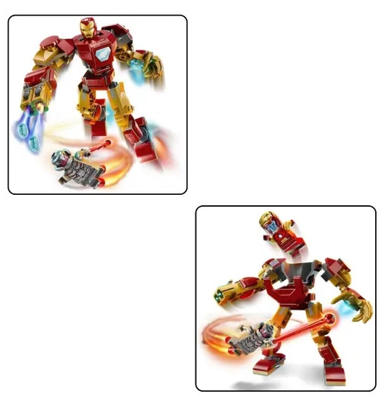 Este conjunto de robôs LEGO Marvel inclui 2 minifiguras: Homem de Ferro com um capacete flip-open e cabeça reversível mostrando expressões alternativas, e Ultron segurando um elemento de raio laser. O robô montável tem braços, pernas e dedos móveis e um disparador de pinos na ponta do braço direito. O tronco se abre para revelar um cockpit onde a minifigura do Homem de Ferro pode sentar.