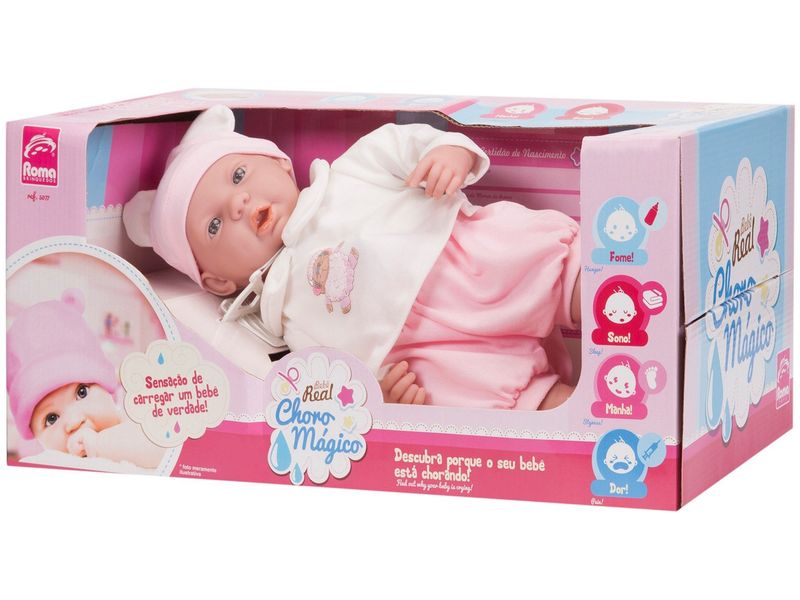 A Boneca Bebê Real - Choro Mágico - da Roma Brinquedos parece um bebê de verdade, você terá a sensação de carregar um recém nascido, pois seu peso é bastante semelhante. Cada vez que você aperta a mãozinha esquerda, ela chora, faz manha, sente dor, fica com sono e fome, e você terá que descobrir o motivo que seu bebê está chorando.