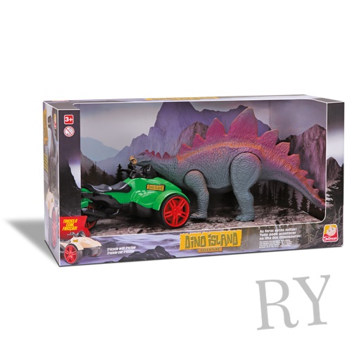 Estegosauro articulado feito em vinil atóxico. Acompanham triciclo com super fricção e pneus de borracha.
